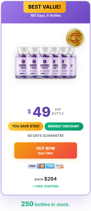 Right now, readers of this page have access to an exclusive discount of up to 73% OFF on the 6-bottle package, plus the company’s ironclad 60-day money-back guarantee. This means you can try MemoMaster completely risk-free: if for any reason you’re not satisfied, you get every penny back — no questions asked.